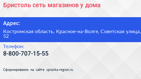 Бристоль, сеть магазинов у дома по адресу Костромская область, Красное-на-Волге, Советская улица, 52 в дальнейшем Организация, размещена в следующих категориях: