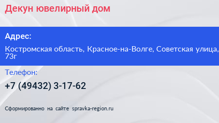 Декун, ювелирный дом по адресу Костромская область, Красное-на-Волге, Советская улица, 73г в дальнейшем Организация, размещена в следующих категориях:
