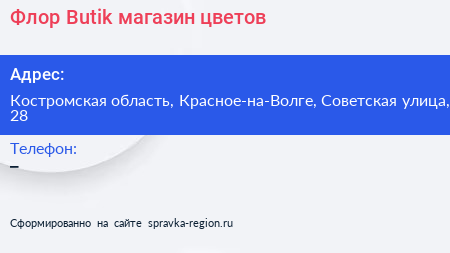 Флор-Butik, магазин цветов по адресу Костромская область, Красное-на-Волге, Советская улица, 28 в дальнейшем Организация, размещена в следующих категориях: