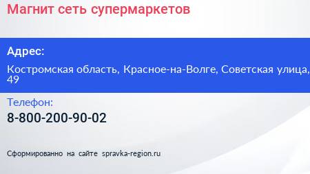 Магнит, сеть супермаркетов по адресу Костромская область, Красное-на-Волге, Советская улица, 49 в дальнейшем Организация, размещена в следующих категориях: