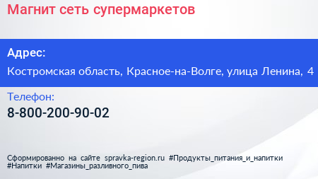 Магнит, сеть супермаркетов по адресу Костромская область, Красное-на-Волге, улица Ленина, 4 в дальнейшем Организация, размещена в следующих категориях: