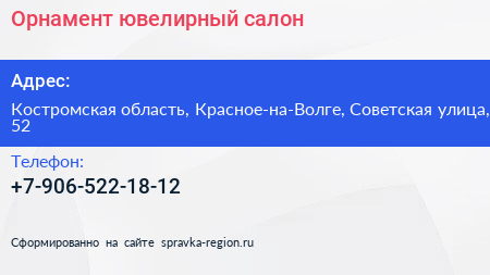 Орнамент, ювелирный салон по адресу Костромская область, Красное-на-Волге, Советская улица, 52 в дальнейшем Организация, размещена в следующих категориях: