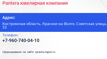 Pantera, ювелирная компания по адресу Костромская область, Красное-на-Волге, Советская улица, 52 в дальнейшем Организация, размещена в следующих категориях: