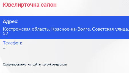 Ювелирточка, салон по адресу Костромская область, Красное-на-Волге, Советская улица, 52 в дальнейшем Организация, размещена в следующих категориях: