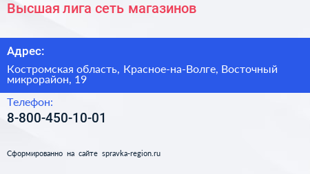 Высшая лига, сеть магазинов по адресу Костромская область, Красное-на-Волге, Восточный микрорайон, 19 в дальнейшем Организация, размещена в следующих категориях: