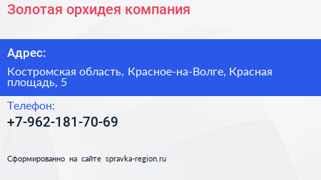 Золотая орхидея, компания по адресу Костромская область, Красное-на-Волге, Красная площадь, 5 в дальнейшем Организация, размещена в следующих категориях: