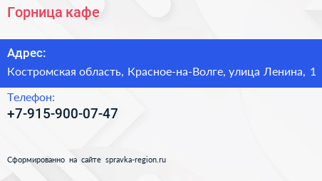 Горница, кафе по адресу Костромская область, Красное-на-Волге, улица Ленина, 1 в дальнейшем Организация, размещена в следующих категориях: