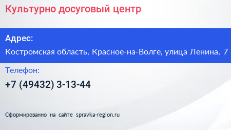 Культурно-досуговый центр по адресу Костромская область, Красное-на-Волге, улица Ленина, 7 в дальнейшем Организация, размещена в следующих категориях: