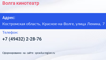 Волга, кинотеатр по адресу Костромская область, Красное-на-Волге, улица Ленина, 7 в дальнейшем Организация, размещена в следующих категориях: