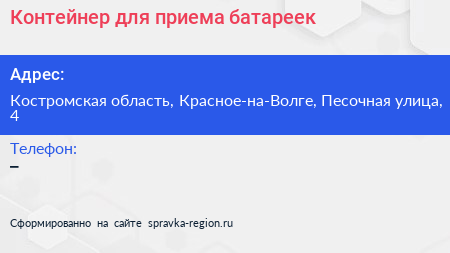 Контейнер для приема батареек по адресу Костромская область, Красное-на-Волге, Песочная улица, 4 в дальнейшем Организация, размещена в следующих категориях: