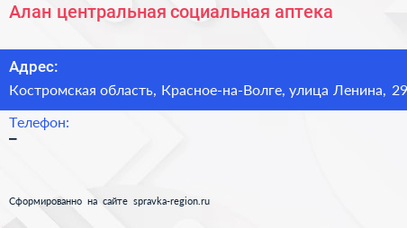 Алан, центральная социальная аптека по адресу Костромская область, Красное-на-Волге, улица Ленина, 29 в дальнейшем Организация, размещена в следующих категориях: