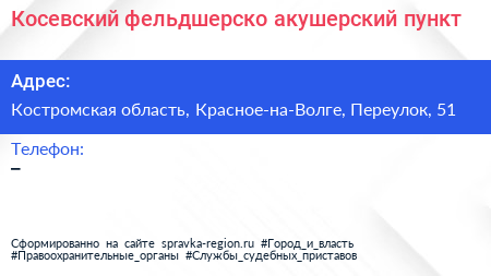 Косевский фельдшерско-акушерский пункт по адресу Костромская область, Красное-на-Волге, Переулок, 51 в дальнейшем Организация, размещена в следующих категориях: