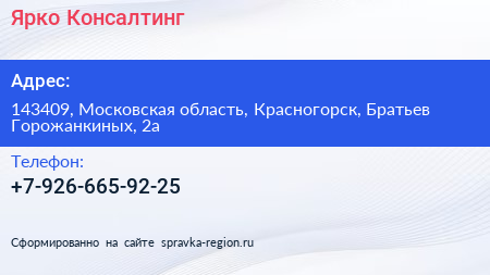 Ярко Консалтинг по адресу 143409, Московская область, Красногорск, Братьев Горожанкиных, 2а в дальнейшем Организация, размещена в следующих категориях: