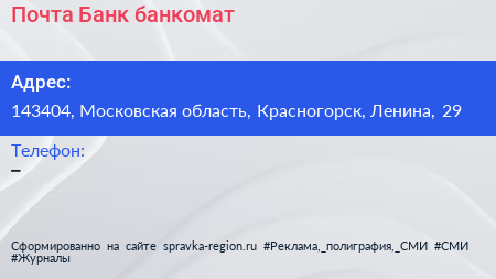 Почта Банк, банкомат по адресу 143404, Московская область, Красногорск, Ленина, 29 в дальнейшем Организация, размещена в следующих категориях: