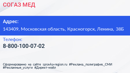 СОГАЗ-МЕД по адресу 143409, Московская область, Красногорск, Ленина, 38Б в дальнейшем Организация, размещена в следующих категориях: