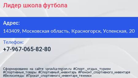 Лидер, школа футбола по адресу 143409, Московская область, Красногорск, Успенская, 20 в дальнейшем Организация, размещена в следующих категориях: