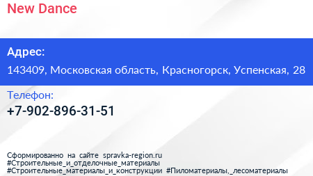 New Dance по адресу 143409, Московская область, Красногорск, Успенская, 28 в дальнейшем Организация, размещена в следующих категориях: