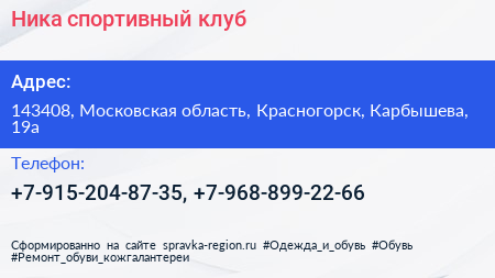 Ника, спортивный клуб по адресу 143408, Московская область, Красногорск, Карбышева, 19а в дальнейшем Организация, размещена в следующих категориях: