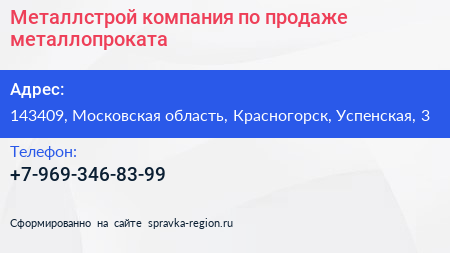 Металлстрой, компания по продаже металлопроката по адресу 143409, Московская область, Красногорск, Успенская, 3 в дальнейшем Организация, размещена в следующих категориях:
