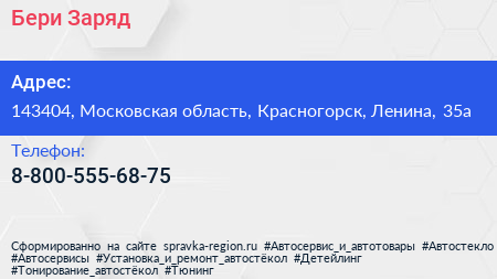 Бери Заряд! по адресу 143404, Московская область, Красногорск, Ленина, 35а в дальнейшем Организация, размещена в следующих категориях: