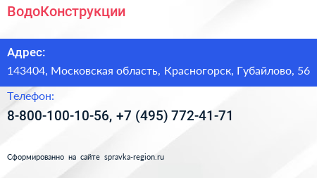 ВодоКонструкции по адресу 143404, Московская область, Красногорск, Губайлово, 56 в дальнейшем Организация, размещена в следующих категориях: