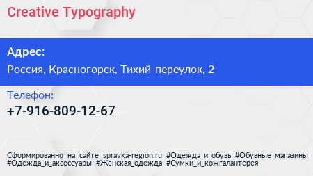 Creative Typography по адресу Ozon, 2, Тихий переулок, Жилой квартал "Аристово-Митино", Аристово, Светлые Горы, городской округ Красногорск, Московская область, Центральный федеральный округ, 143442, Россия в дальнейшем Организация, размещена в следующих категориях: