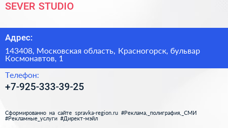 SEVER.STUDIO по адресу 143408, Московская область, Красногорск, бульвар Космонавтов, 1 в дальнейшем Организация, размещена в следующих категориях: