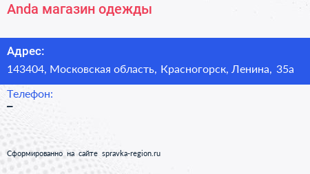 Anda, магазин одежды по адресу 143404, Московская область, Красногорск, Ленина, 35а в дальнейшем Организация, размещена в следующих категориях: