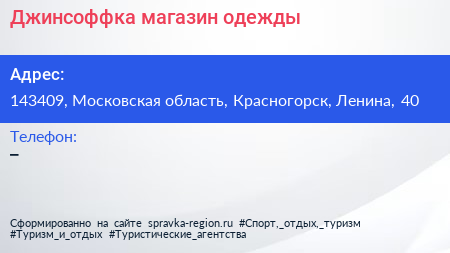 Джинсоффка, магазин одежды по адресу 143409, Московская область, Красногорск, Ленина, 40 в дальнейшем Организация, размещена в следующих категориях: