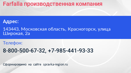 Farfalla, производственная компания по адресу 143443, Московская область, Красногорск, улица Широкая, 2а в дальнейшем Организация, размещена в следующих категориях: