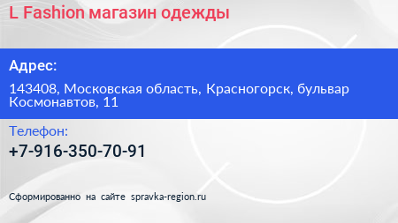 L Fashion, магазин одежды по адресу 143408, Московская область, Красногорск, бульвар Космонавтов, 11 в дальнейшем Организация, размещена в следующих категориях: