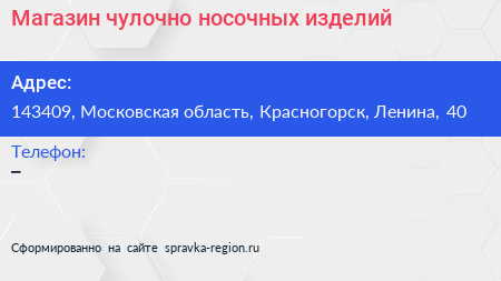 Магазин чулочно-носочных изделий по адресу 143409, Московская область, Красногорск, Ленина, 40 в дальнейшем Организация, размещена в следующих категориях: