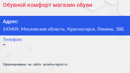 Обувной комфорт, магазин обуви по адресу 143409, Московская область, Красногорск, Ленина, 38Б в дальнейшем Организация, размещена в следующих категориях: