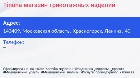 Tinona, магазин трикотажных изделий по адресу 143409, Московская область, Красногорск, Ленина, 40 в дальнейшем Организация, размещена в следующих категориях: