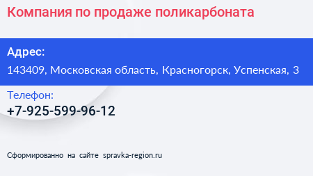 Компания по продаже поликарбоната по адресу 143409, Московская область, Красногорск, Успенская, 3 в дальнейшем Организация, размещена в следующих категориях: