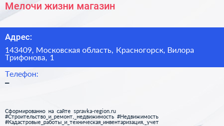 Мелочи жизни, магазин по адресу 143409, Московская область, Красногорск, Вилора Трифонова, 1 в дальнейшем Организация, размещена в следующих категориях:
