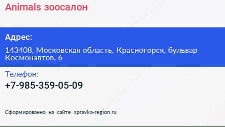 Animals, зоосалон по адресу 143408, Московская область, Красногорск, бульвар Космонавтов, 6 в дальнейшем Организация, размещена в следующих категориях: