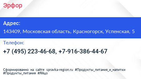 Эрфор по адресу 143409, Московская область, Красногорск, Успенская, 5 в дальнейшем Организация, размещена в следующих категориях: