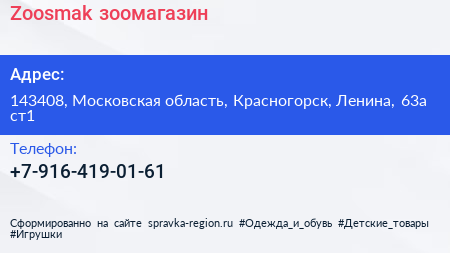 Zoosmak, зоомагазин по адресу 143408, Московская область, Красногорск, Ленина, 63а ст1 в дальнейшем Организация, размещена в следующих категориях: