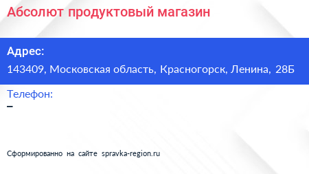 Абсолют, продуктовый магазин по адресу 143409, Московская область, Красногорск, Ленина, 28Б в дальнейшем Организация, размещена в следующих категориях: