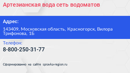 Артезианская вода, сеть водоматов по адресу 143409, Московская область, Красногорск, Вилора Трифонова, 1Б в дальнейшем Организация, размещена в следующих категориях: