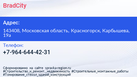 BradCity по адресу 143408, Московская область, Красногорск, Карбышева, 19а в дальнейшем Организация, размещена в следующих категориях: