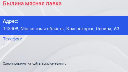 Былина, мясная лавка по адресу 143408, Московская область, Красногорск, Ленина, 63 в дальнейшем Организация, размещена в следующих категориях: