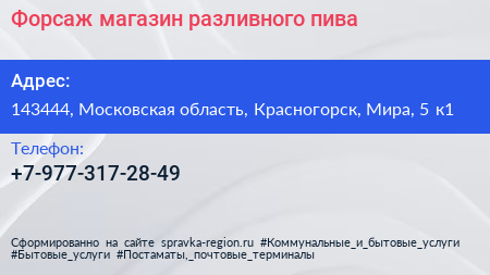 Форсаж, магазин разливного пива по адресу 143444, Московская область, Красногорск, Мира, 5 к1 в дальнейшем Организация, размещена в следующих категориях: