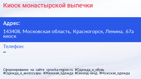 Киоск монастырской выпечки по адресу 143408, Московская область, Красногорск, Ленина, 67а киоск в дальнейшем Организация, размещена в следующих категориях: