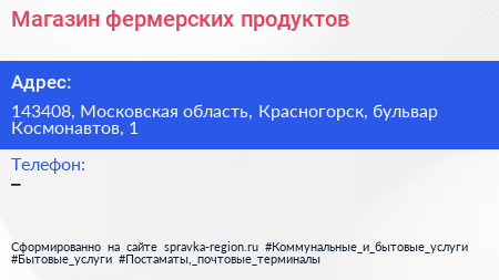 Магазин фермерских продуктов по адресу 143408, Московская область, Красногорск, бульвар Космонавтов, 1 в дальнейшем Организация, размещена в следующих категориях: