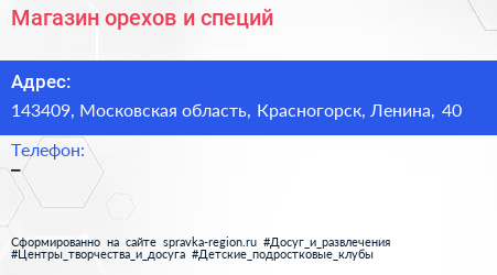 Магазин орехов и специй по адресу 143409, Московская область, Красногорск, Ленина, 40 в дальнейшем Организация, размещена в следующих категориях: