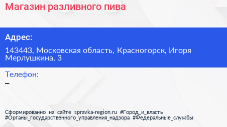 Магазин разливного пива по адресу 143443, Московская область, Красногорск, Игоря Мерлушкина, 3 в дальнейшем Организация, размещена в следующих категориях: