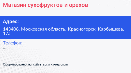 Магазин сухофруктов и орехов по адресу 143408, Московская область, Красногорск, Карбышева, 17а в дальнейшем Организация, размещена в следующих категориях: