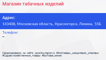 Магазин табачных изделий по адресу 143408, Московская область, Красногорск, Ленина, 55Б в дальнейшем Организация, размещена в следующих категориях: